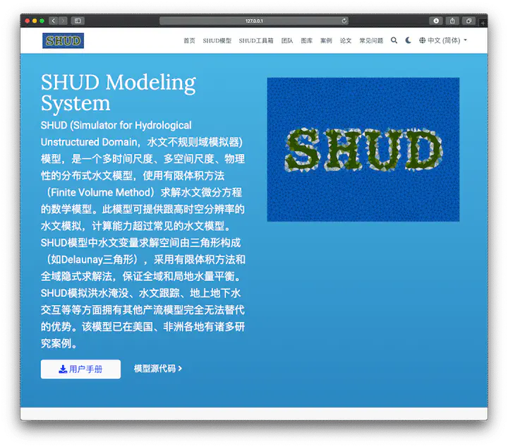 SHUD模型网站正式上线最近更新于 12月 15, 2025 1 分钟阅读时长SHUD模型网站https://www.shud.xyz正式上线。News Website SHUD RSHUD 水文模型舒乐乐水文学博士、研究员、博士生导师中国科学院西北生态环境资源研究院研究员,兰州大学兼职教授,SHUD模型作者; 从事数值水文模型研发、“大气-陆面-水文”模型耦合、气候/人类活动对水循环的影响研究相关SHUD模型网站正式上线SHUD数值方法分布式水文模型介绍SHUD (Simulator for Hydrologic Unstructured Domains,水文非结构域模拟器) v1.0 正式发布2022 年中国水文地理学术年会 (2022-09-23, 江苏南京)SHUD模型应用与合作研讨会 (2022-6-27, 西安山脉)